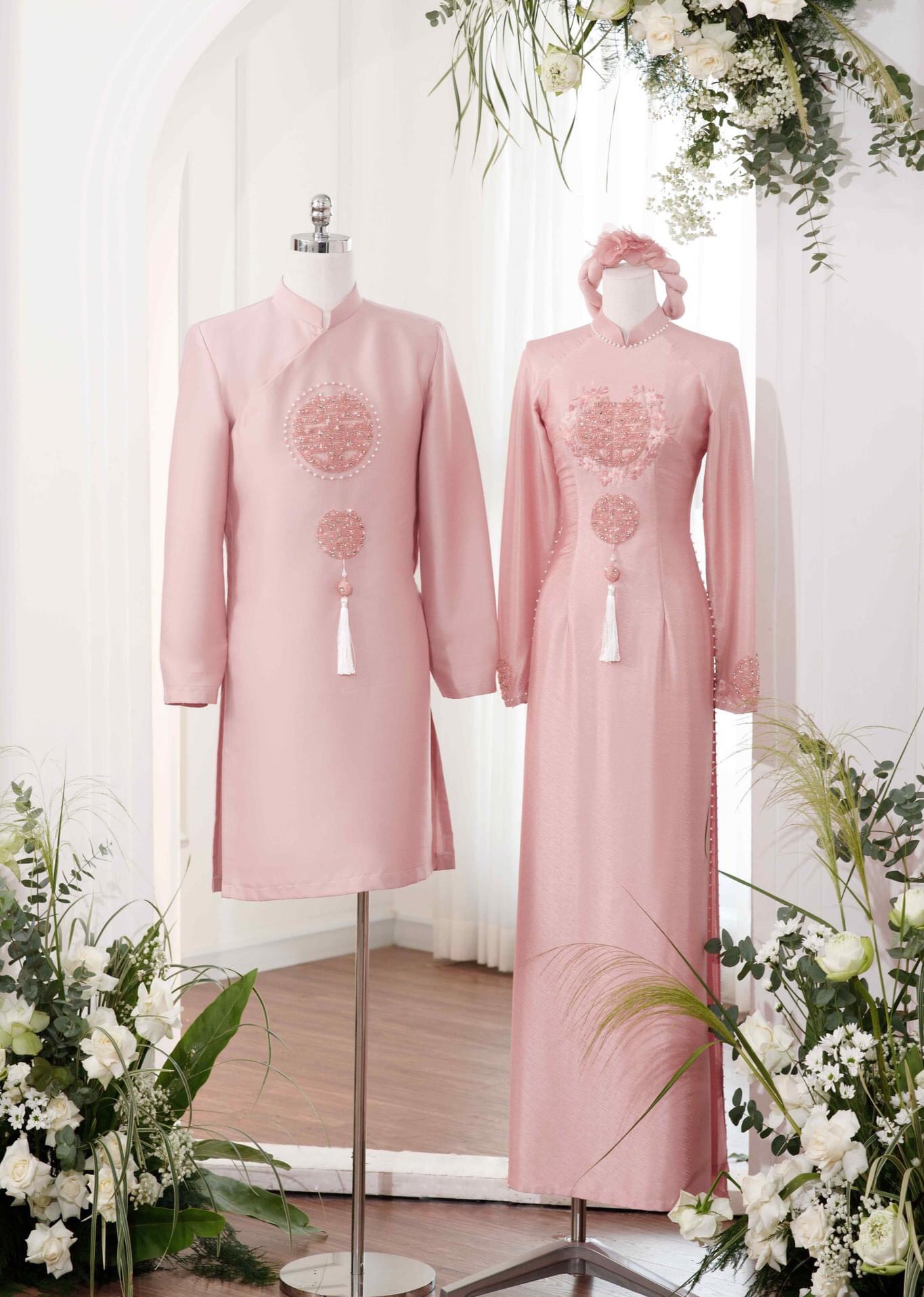 • Áo Dài Cưới Cặp Đôi Chữ Hỷ Màu Hồng Ngọt Ngào