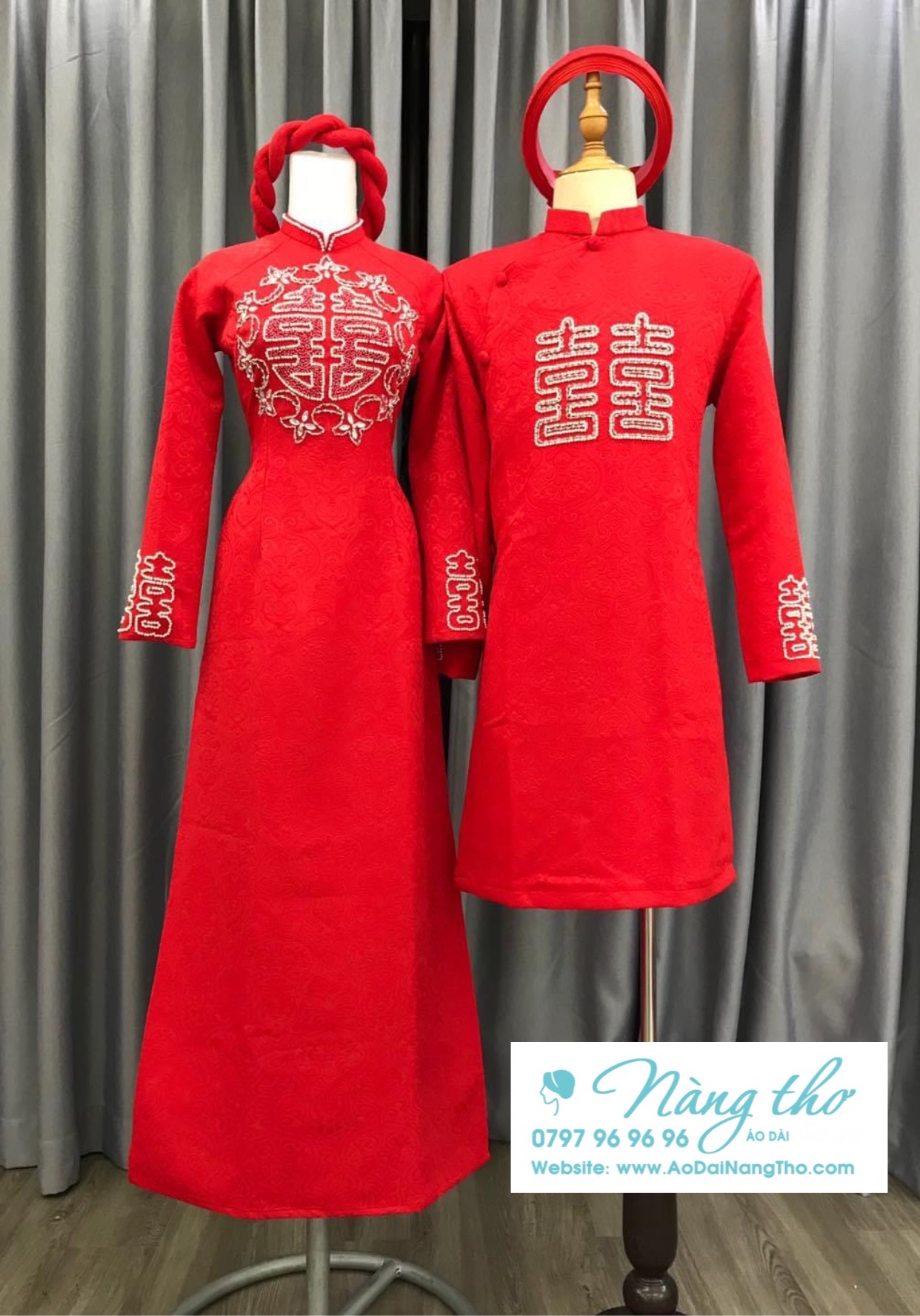 • Áo Dài Cưới Cặp Đôi Gấm Đỏ Kết Hạt Cao Cấp Chữ Hỉ
