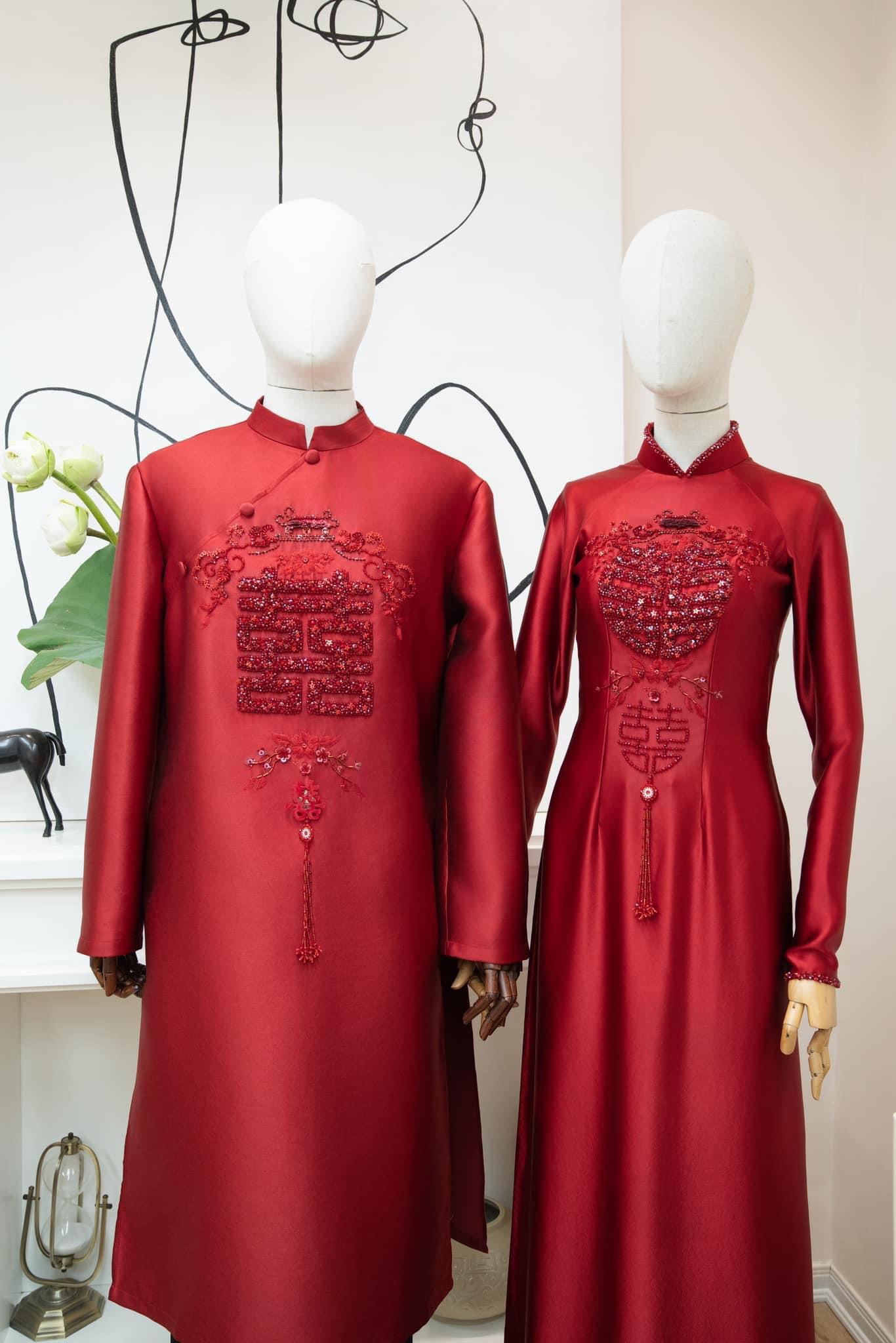 Áo Dài Cưới Cặp Đôi Gấm Vân Gỗ Thêu Đính Họa Tiết Song Hỷ