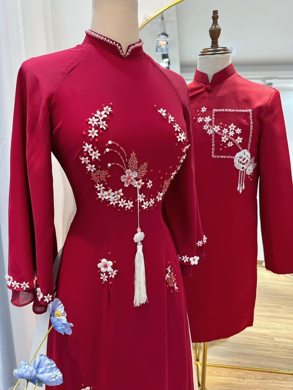 • Áo Dài Cưới Cặp Đôi Lụa Đỏ Kết Hoa