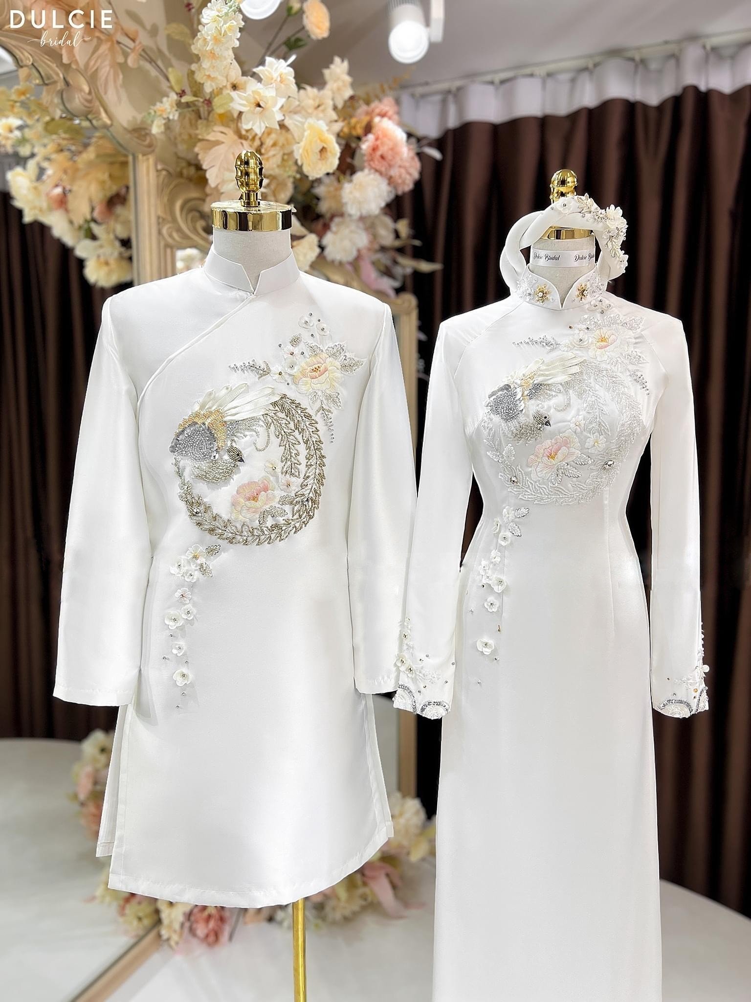 • Áo Dài Cưới Cặp Đôi Trắng Thêu Và Đính Kết Tinh Xảo