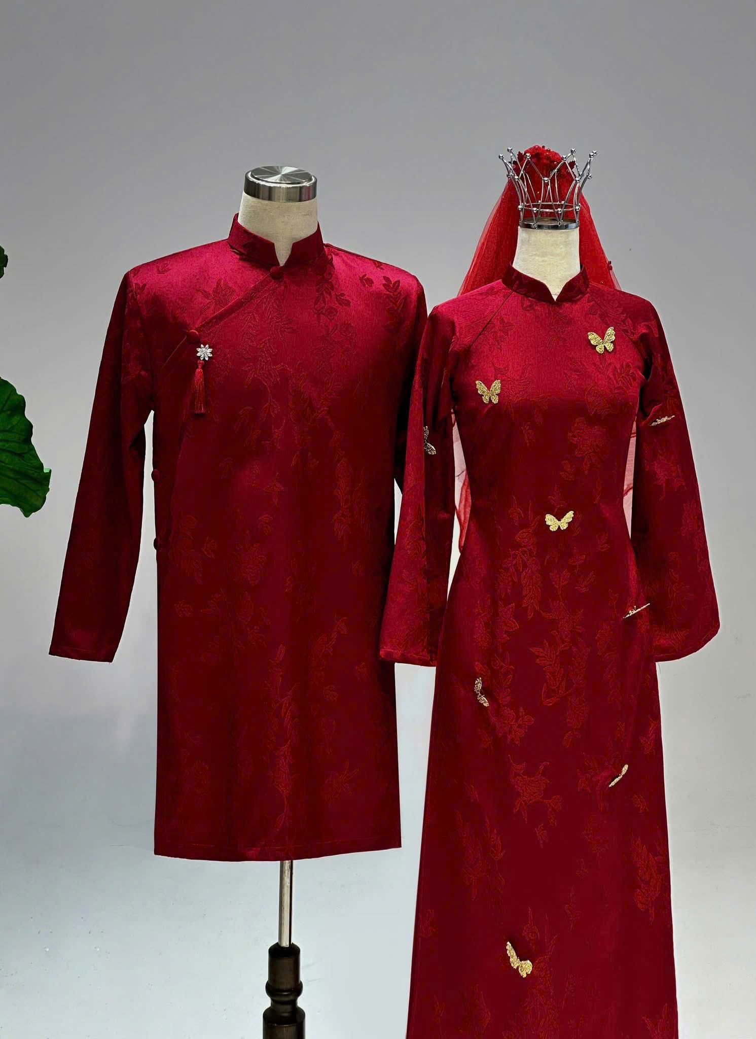 • Áo Dài Cưới Gấm Vân Hoa Đỏ Đô Sang Trọng