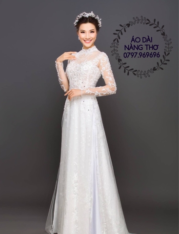 Áo Dài Cô Dâu Ren Lưới Màu Trắng Kết Hoa Nổi 3D WR0065