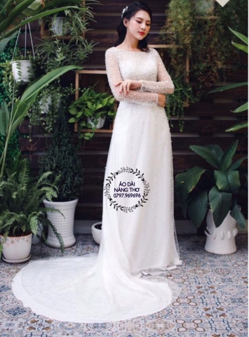 Áo Dài Cô Dâu Ren Lưới Màu Trắng Kết Hạt Pha Lê WR0064