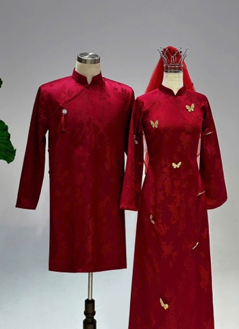 Áo Dài Cưới Gấm Vân Hoa Đỏ Đô Sang Trọng CP0236