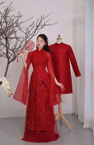 Áo Dài Cưới Gấm Vân Hoa Đỏ Đô Sang Trọng CP0237