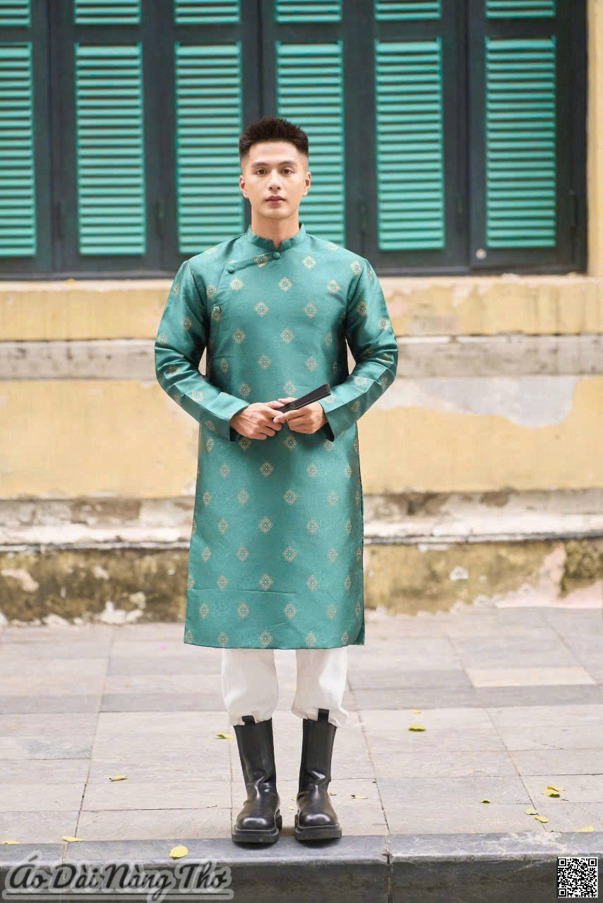 • Áo Dài Nam Gấm Xanh Cổ Vịt Họa Tiết Nhí Thanh Lịch