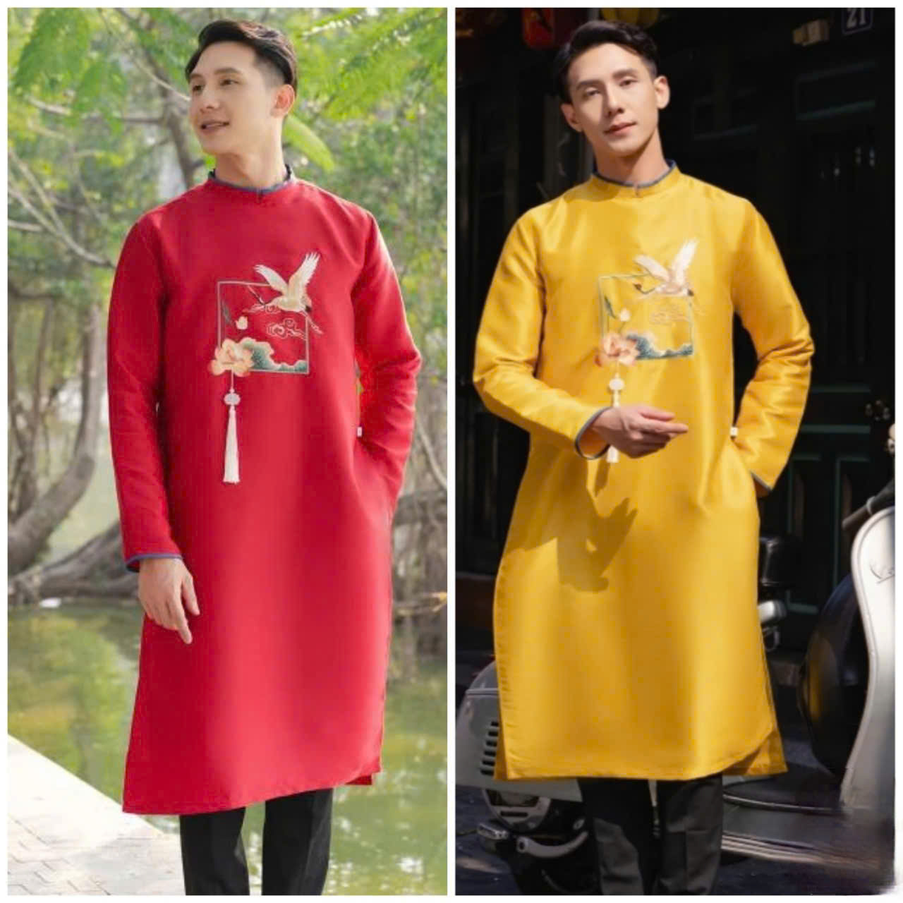 • Áo Dài Nam Họa Tiết Chim Hạc Sang Trọng
