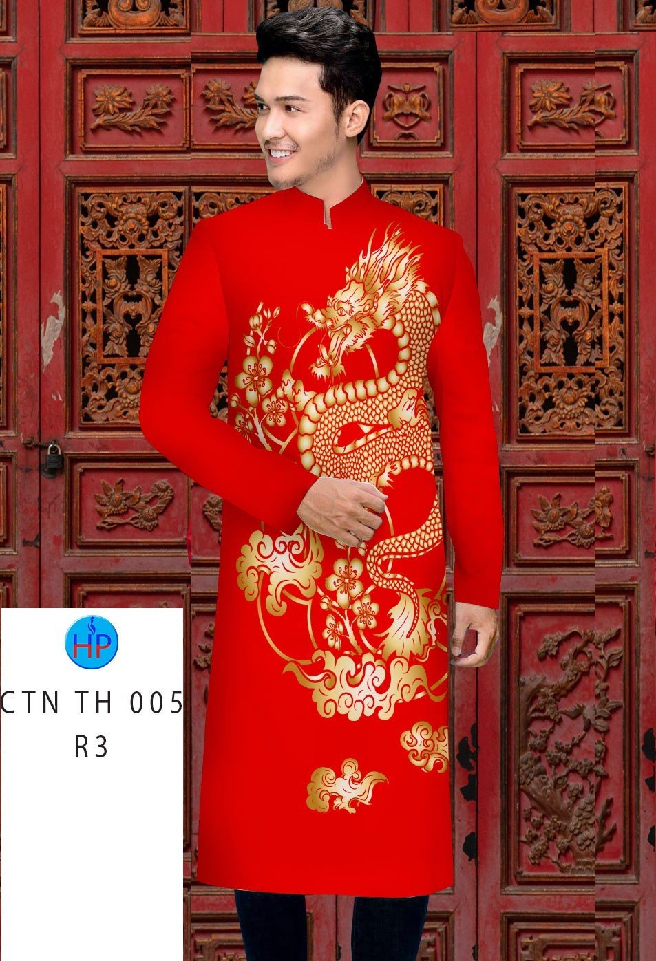 • Áo Dài Nam Màu Đỏ In Họa Tiết Rồng Vàng