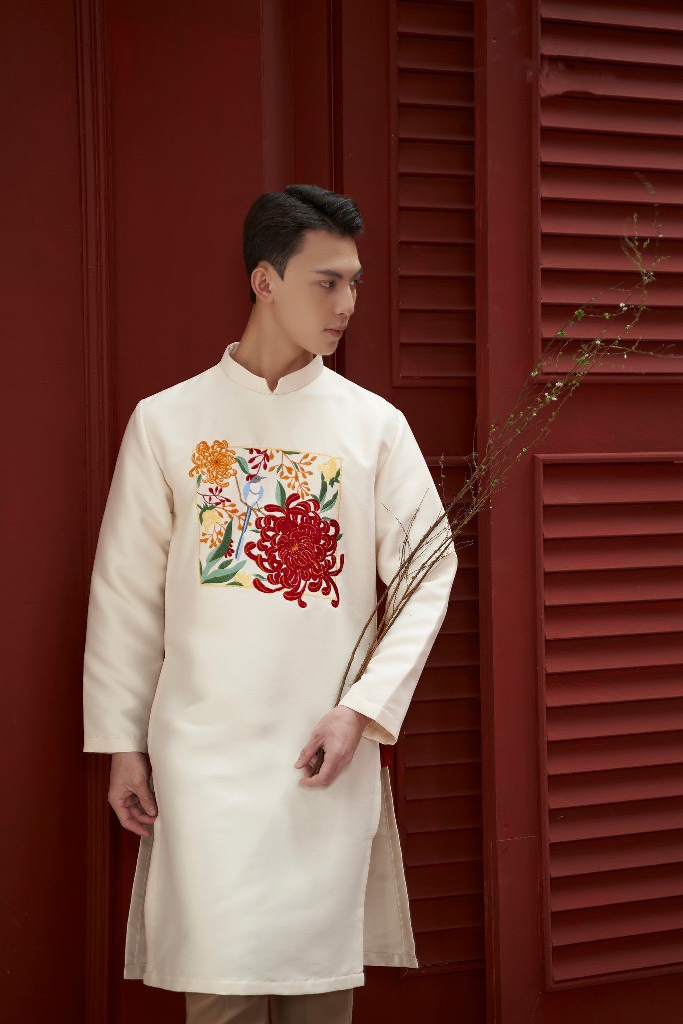 • Áo Dài Nam Màu Trắng Thêu Hoa Bỉ Ngạn