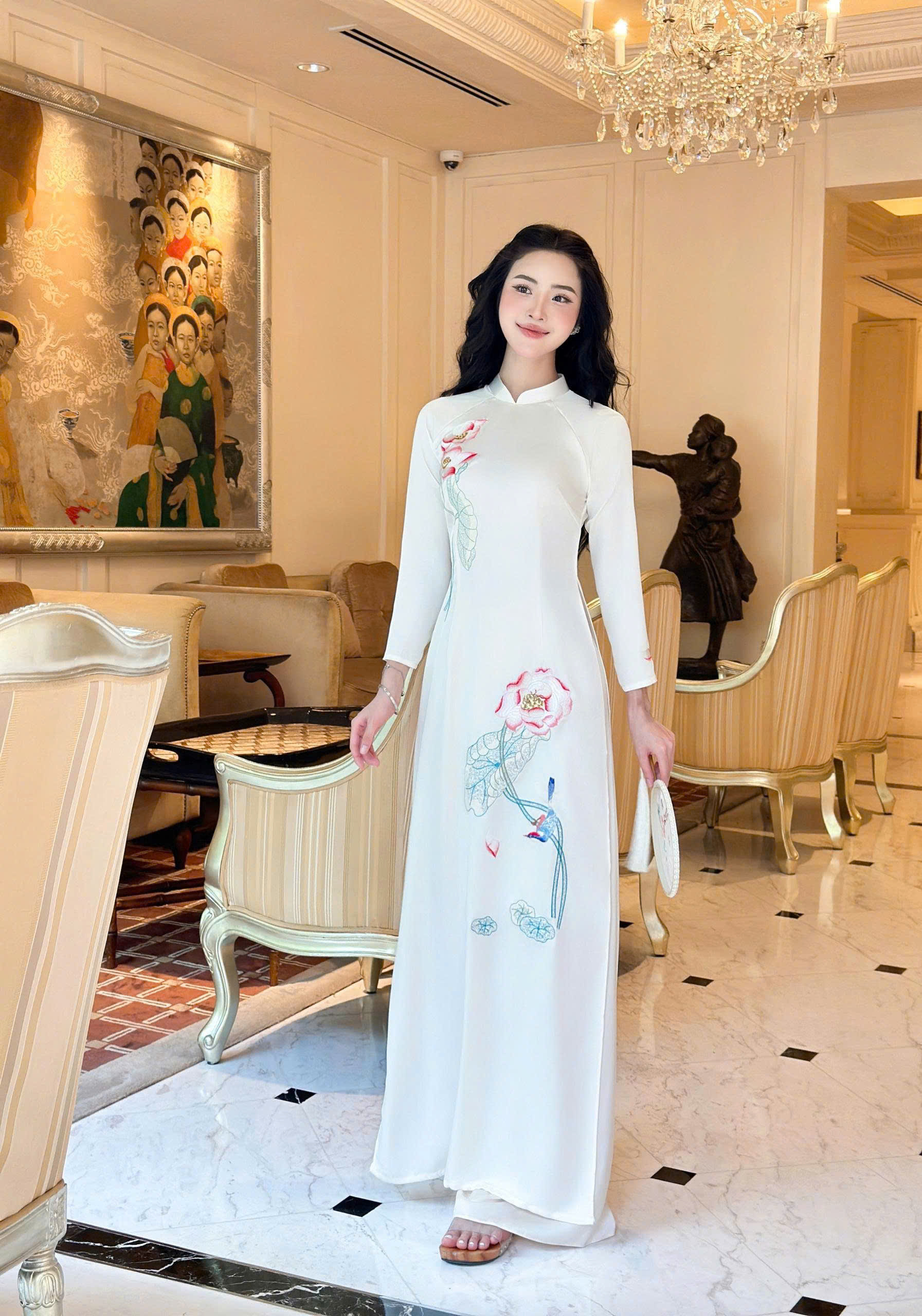 Áo Dài Truyền Thống Vải Lụa Thêu Hoa Sen Nền Nã