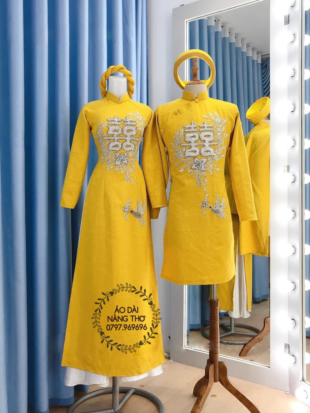 • Áo Dài Cưới Cặp Đôi Gấm Vàng Đính Hạt Cao Cấp